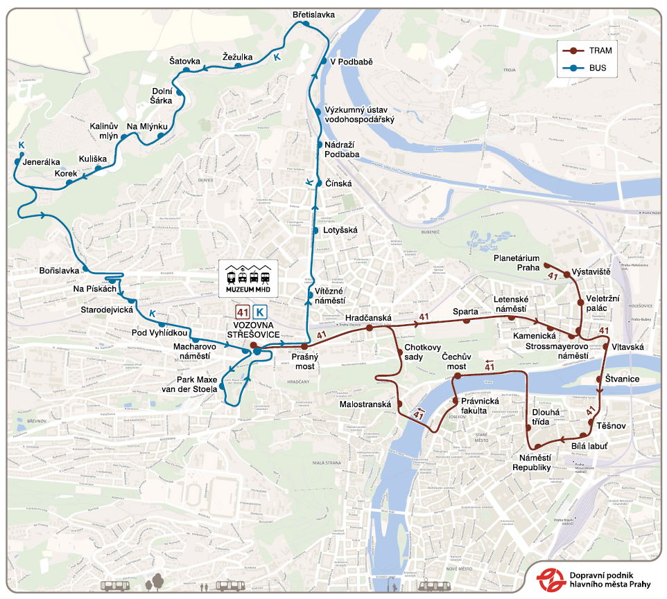 Od soboty 28. března 2026 Dopravní podnik hl. m. Prahy (DPP) zahájí provoz historické tramvajové linky 41 a autobusové linky K. Obě budou v provozu o víkendech a státních svátcích do 17. listopadu 2026.
